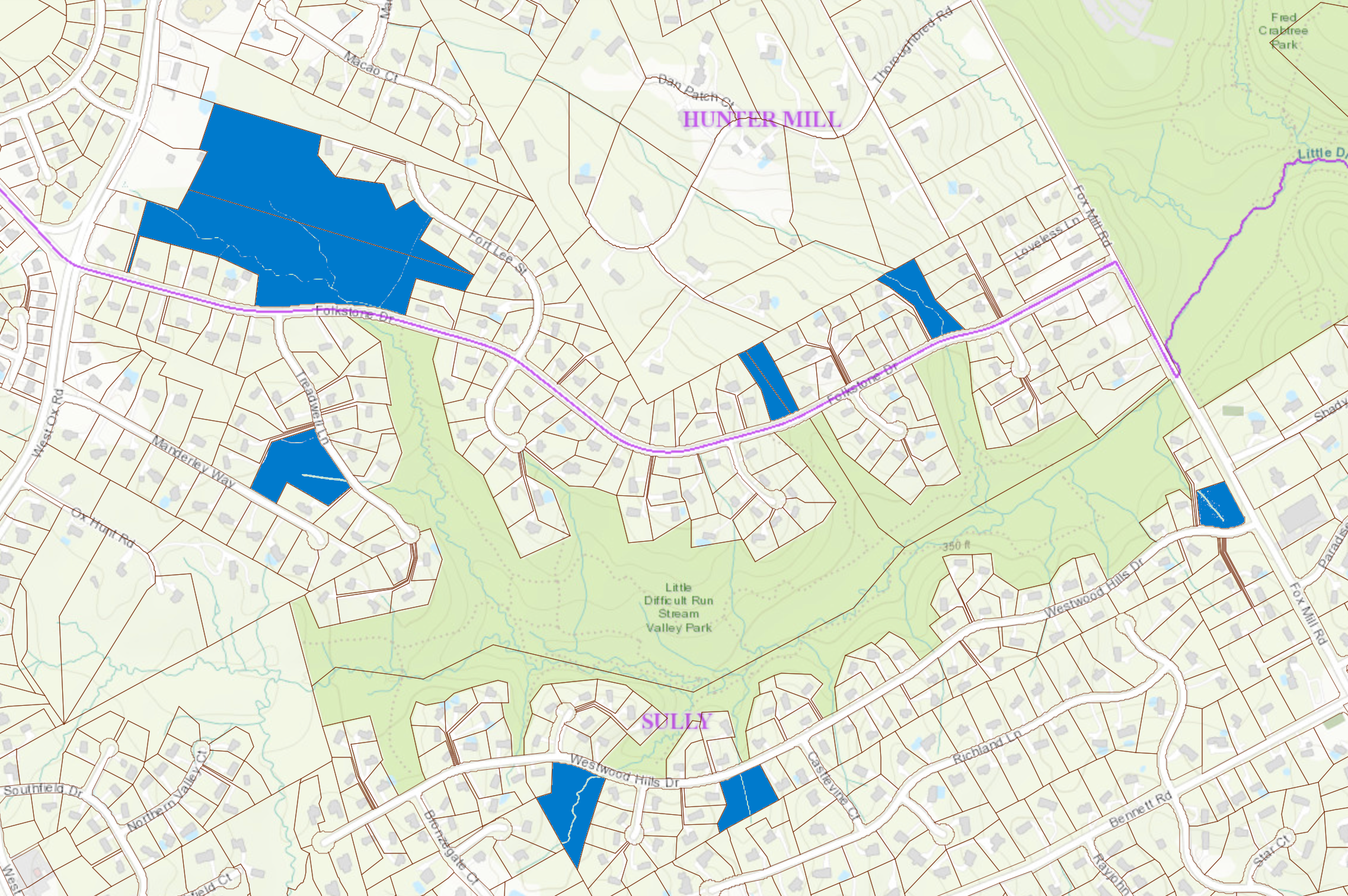 Areas in blue are considered common property and are maintained by the HOA. Little Difficult Run is a Fairfax County Park with many trails, maintained by the county park service.